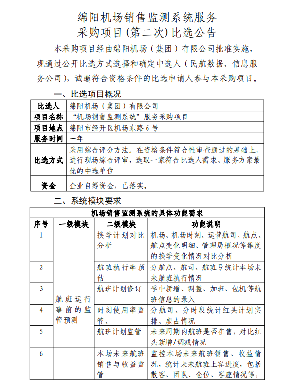 綿陽機(jī)場銷售監(jiān)測系統(tǒng)服務(wù)采購項目(第二次)比選公告