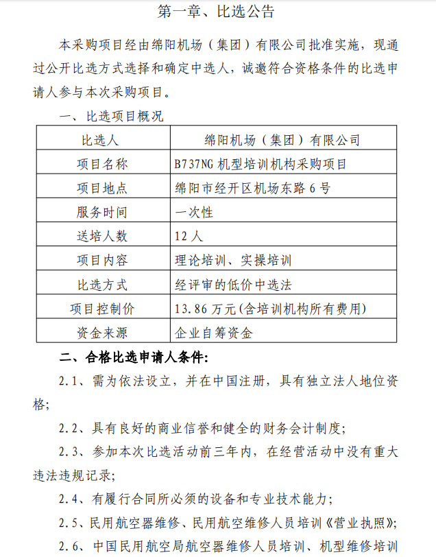 綿陽機(jī)場B737NG機(jī)型培訓(xùn)機(jī)構(gòu)采購項(xiàng)目比選公告