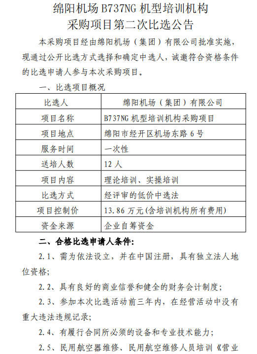 綿陽機(jī)場B737NG機(jī)型培訓(xùn)機(jī)構(gòu)采購項(xiàng)目第二次比選公告